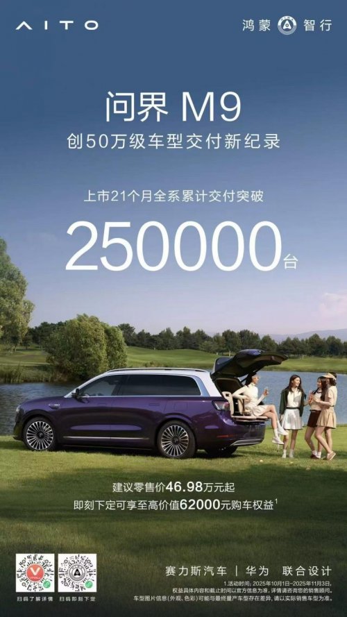 目前,问界全系累计交付已突破80万辆,持续刷新中国新能源豪华品牌最快交付纪录。问界M9上市21个月累积交付突破25万辆,创50万级车型交付新纪录;上市仅五个月的问界M8交付破10万辆,强势领跑40万级市场;全新问界M7上市36天累计交付突破20000台。亮眼数据的背后,不仅是问界卓越的产品力,更是其“全心全意为用户服务”的兑现。